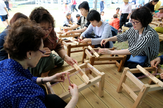 10일 충남 서천군 한산면 ‘제30회 한산모시문화제’ 마지막 날 행사를 찾은 관광객들이 미니 베틀을 이용해 모시 짜기 체험을 하고 있다.