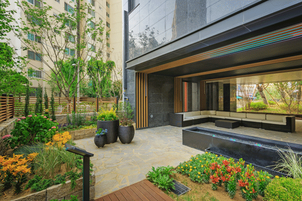 필로티 가든 내부에는 휴게 소파를 배치해 거실과 같은 편안한 분위기를 연출하고, 물과 꽃이 어우러진 정원 공간을 즐길 수 있도록 조성했다.
