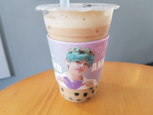 버블티 브랜드 아마스빈은 팬들의 후원으로 전국 160여 개 지점에서 BTS 컵 홀더(사진)를 총 17만 장 마련했다. 지난 11일∼12일 BTS 멤버 뷔 사진이 담긴 컵 홀더가 나간 데 이어 13일부터는 멤버 슈가 컵 홀더가 증정된다. 아마스빈 관계자는 “BTS 홈마스터(아이돌 사진을 전문적으로 찍어 올리는 팬)의 지원으로 지난 3월 멤버 슈가 생일에 컵 홀더 이벤트를 열었던 인연이 이어져 데뷔일에도 행사를 진행하게 됐다”고 설명했다.