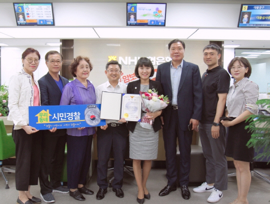 NH농협은행 경기영업본부는 분당정자역 지점의 이현주(오른쪽 네 번째) 팀장이 보이스피싱 피해를 예방한 공로로 분당경찰서로부터 감사장을 받았다고 14일 밝혔다. 이 팀장은 3500만 원을 이체하려는 고객이 불안감을 느끼는 것을 이상하게 여겨 경찰에 알리고, 고객을 설득해 보이스피싱을 예방했다.