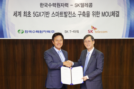 SK텔레콤은 13일 서울 을지로 T타워에서 박정호(왼쪽) 사장이 정재훈 한국수력원자력 사장과 4차 산업혁명 기반의 정보통신기술 경쟁력 강화를 위한 협약을 체결했다. 양사는 협약을 통해 5세대 이동통신·인공지능·빅데이터 등 ICT 기술을 적용한 스마트 발전소 구축 등 다양한 분야에서 협력하기로 했다.