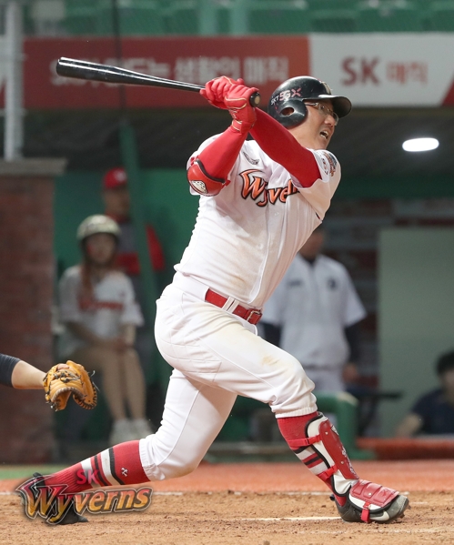 NC 선발 박진우의 몸쪽 공을 끌어당겨 우익수 앞에 떨어지는 안타로 2루 주자 한동민을 홈에 불러들였다.