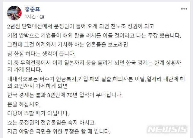 홍 전 대표는 이날 자신의 페이스북을 통해 “대내적으로는 퍼주기 현금복지·기업 해외 탈출·해외자본 이탈·일자리 대란에 해외 요인까지 가세하게 되면 한국 경제는 불과 3년 만에 70년 업적이 무너진다”며 이같이 밝혔다.