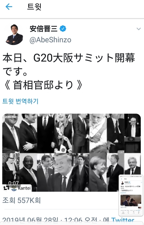 28일 오전 10시 30분께 트위터와 인스타그램의 아베 신조(安倍晋三) 일본 총리 계정에 G20 회의 개막 상황을 속보로 전하는 게시물이 올라왔다.