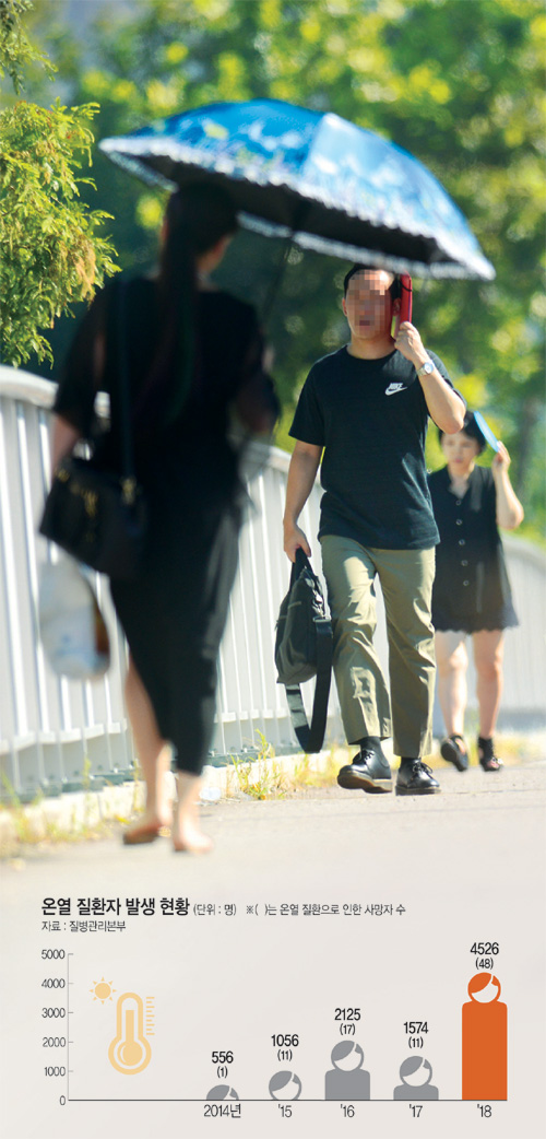 2일 질병관리본부의 온열 질환 감시체계에 따르면 지난해 감시체계 운영 기간(2018년 5월 20일부터 9월 10일까지) 중 신고된 온열 질환자는 총 4526명이었고 이 중 48명은 사망에 이르렀다. 감시체계 운영을 시작한 2011년 이후 가장 온열질환자 신고가 많았다. 2017년(1574명)에 비해서는 약 3000명이 급증해 세 배 가까이로 늘어났다. 평년 9.8일인 폭염 일수가 31.4일, 열대야 일수도 17.7일(평년 5.1일)에 달하는 기록적인 더위가 장기간 지속됐던 탓이다.