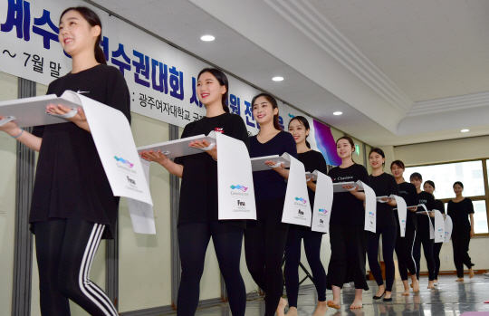 ‘2019 광주FINA세계수영선수권대회’ 개막을 11일 앞둔 1일 광주 광산구 광주여대 황룡관에서 시상요원들이 시상식 예행연습을 하고 있다.