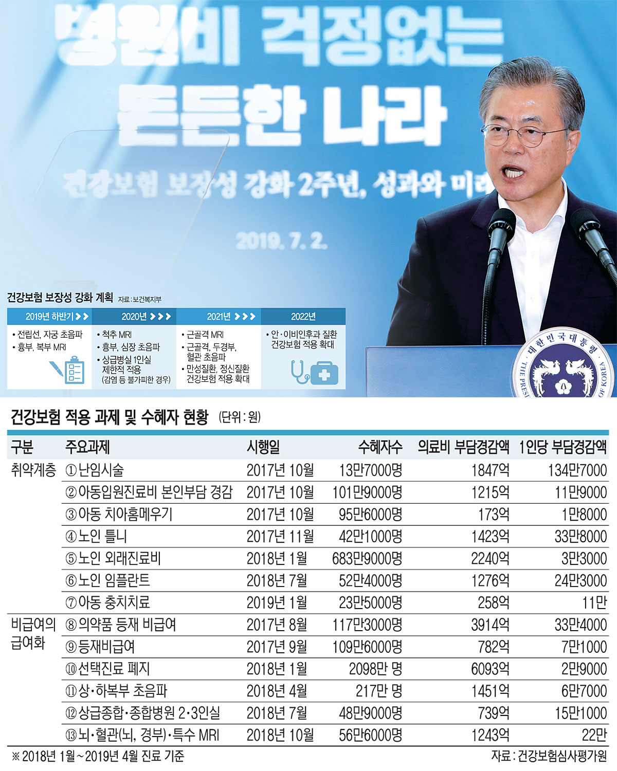 2019년은 전 국민 건강보험이 시행된 지 30주년이 되는 해다. 오는 8월이면 문재인 정부의 건강보험 보장성 강화 정책(일명 문재인 케어)이 2주년을 맞는 해이기도 하다. 문 대통령은 지난 2일 국민건강보험공단 일산병원에서 열린 건보 시행 30주년 및 건보 보장성 강화대책 2주년 성과 보고대회에서 “건보 보장률은 현재 집계가 가능한 종합병원 이상으로만 보면, 2016년의 62.6%에서 2018년 67.2%로 크게 높아졌다. 임기 내에 전체적인 보장률을 70%까지 높인다는 것이 문재인 케어의 목표”라면서 “이러한 노력의 결과 지난해 1월부터 올해 4월까지 국민의료비 지출이 총 2조2000억 원 절감됐다”고 말했다. 하지만 따져보지 않으면 어떤 의료 혜택이 늘어났는지 기억하고 활용하기 어려운 측면이 있다. 지난 2년간 혜택이 늘어난 의료 복지 서비스와 하반기 이후 확대될 서비스의 내용을 알아본다. 또 최근 논란이 된 대형병원 쏠림 현상과 건보 재정 문제에 대해서도 살펴본다.