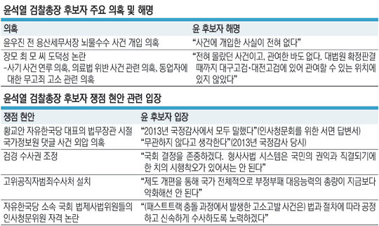 윤 후보자는 이날 청문회에서 주광덕 자유한국당 의원으로부터 “검사 재직 중 다른 사람에게 변호사를 소개해준 적이 있느냐”는 질문을 받고 “그런 사실이 없다”고 답했다. ‘윤 전 서장과 서울의 한 호텔에서 고급 양주를 마신 사실이 있느냐’는 질의에 대해선 “1년에 한두 번 윤 전 서장과 식사한 건 맞는데 저녁을 과하게 한 기억은 없다”고 선을 그었다.