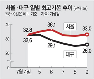 8일 기상청에 따르면 8∼9일 서울 낮 최고기온은 32∼33도를 기록하는 반면, 대구는 25∼26도에 머물 것으로 관측됐다. 앞서 지난 6일만 해도 서울의 낮 최고기온은 36.1도까지 올라 7월 상순 기온으로는 80년 만에 가장 높았다. 36도 이상의 폭염으로는 역대 가장 더웠던 지난해 여름보다 보름이나 빠른 기록이다. 수도권도 폭염경보(35.0도 이상) 수준의 더위가 이어지고 있다. 반면 대구는 6일과 7일 낮 최고기온이 29.1도, 26.7도에 불과했다.