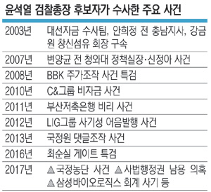 ‘권력 눈치 보지 않는 수사’로 명망이 높던 윤 후보자의 그간 주요 수사도 인사청문회를 계기로 재평가되는 분위기다. 윤 후보자는 무혐의 처분을 받은 이명박 전 대통령이 연루된 BBK 특검에 파견검사로 일했다. 이명박 정부 출범 직후 대검 중수과장을 거쳐 서울중앙지검 특수1부장까지 올라 승승장구했다. 이 전 대통령의 정적인 박근혜 전 대통령 취임 이후엔 국가정보원의 선거 개입 사건의 수사 무마를 시도하던 윗선에 반발하다가 좌천됐다. 일각에서는 윤 후보자가 진두지휘했던 2010년 C&그룹 비자금 사건 수사에 대해서도 “정권에 충성하기 위한 수사였다”는 정반대의 재평가도 있다.