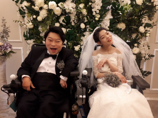 지난 5월 결혼식을 올린 이상우(39·사진 왼쪽)-최영은(여·29·오른쪽) 부부의 결혼 초대장 내용 일부다. 두 사람은 꽃동네에서 나와 결혼한 첫 커플이다. 또 뇌병변 장애인 부부다. 둘은 결혼으로 더 이상 혼자가 아닌 함께 ‘존재의 투쟁’을 시작했다고 말한다.