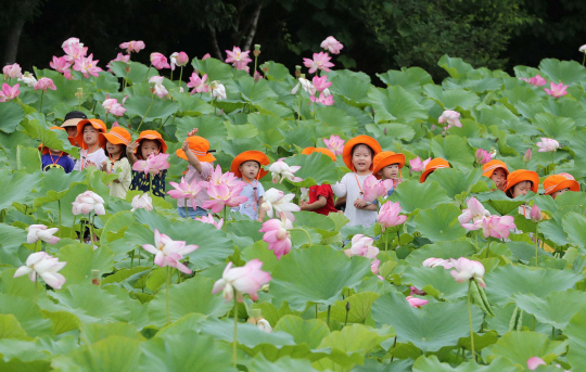 장맛비가 소강상태를 보인 11일 경남 함양군 상림공원을 찾은 어린이들이 활짝 핀 연꽃 속에 파묻혀 즐거워하고 있다.