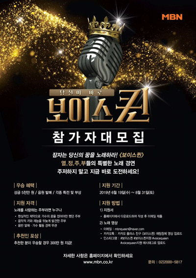 지난달 19일 시작된 지원자 모집은 오는 8월 31일까지 진행된다. ‘보이스퀸’ 우승자에게는 상금과 주요 음원 사이트를 통한 음원 발매, 각종 특전 등이 제공된다. 또한, 주변의 실력자를 추천해 준 이들에게도 해당 참가자가 우승 시 소정의 상금을 전달할 계획이다.