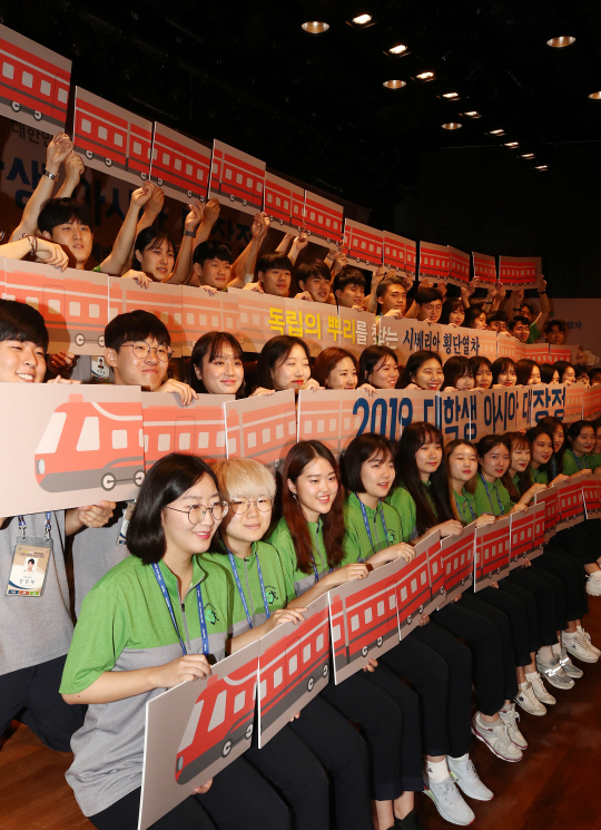 지난 25일 서울 종로구 교보생명에서 열린 ‘2019 대학생 아시아 대장정 발대식’에서 참가 학생들이 카드섹션 퍼포먼스를 하고 있다. 참가자들은 7박 8일간 항일독립운동의 발자취를 따라 러시아 연해주 일대를 탐방한다.