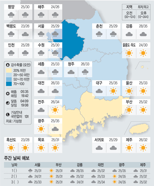 새벽 경기 북부부터 비가 시작돼 아침에는 서울, 경기 남부와 강원 영서 지역으로 차차 확대되겠다. 전라 동부내륙과 경남 서부내륙은 오후에 곳에 따라 소나기가 내리겠다. 아침 최저기온은 22도에서 28도, 낮 최고기온은 28도에서 35도가 되겠다.