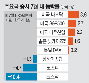 7월 들어 한국 증시의 하락은 같은 기간 미국 다우존스산업평균지수가 2.3%, 스탠다드앤드푸어스(S&P) 500지수가 2.7% 각각 상승한 것과 대조적이다. 미·중 무역 분쟁의 당사국인 중국의 상하이종합지수는 7월 들어 1.3% 하락하는 데 그쳤으며, 한국에 대한 경제 보복조치로 마찰을 빚고 있는 일본의 닛케이225 지수는 오히려 1.6% 올랐다. 정세가 불안정한 터키와 아르헨티나의 주가도 같은 기간 각각 7.1%, 4.8% 상승했다.