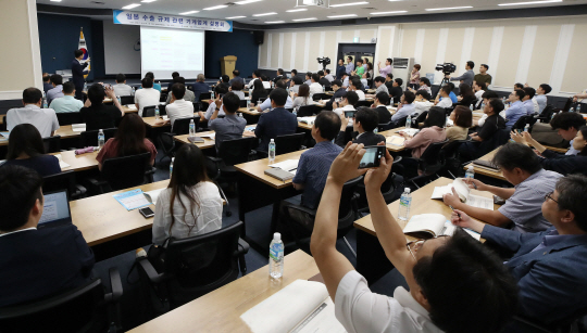 31일 서울 영등포구 여의동 기계회관에서 열린 ‘일본 수출 규제 관련 기계업계 설명회’에서 참석자들이 강연자인 류세희 전략물자관리원 제재대응실장의 발표를 경청하고 있다.