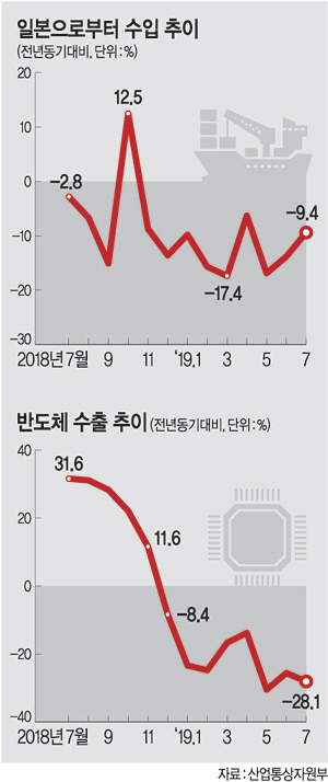 수출국 다변화와 반도체를 중심으로 특정 품목에 의존하는 산업구조 재편 없이는 수출 회복이 쉽지 않다는 분석이 나오는 가운데 일본의 경제보복마저 ‘복병’으로 떠올랐다. 산업부는 “지난 7월 1일 일본의 수출규제 발표 이후 우리 7월 수출에 미친 영향은 현재까지 제한적인 것으로 보인다”고 밝혔다. 하지만 이미 주요 소재·부품 수입이 줄어든 데다 2일 화이트리스트(수출 절차 간소화 국가) 배제가 확정될 경우 우리 수출에 미치는 악영향이 급속도로 빨라질 수 있다는 전망이 나온다. 7월 일본으로부터의 수입은 1년 전보다 9.4% 줄었다. 품목별(7월 1~25일)로는 반도체 제조용 장비(-2.2%), 고철(-7.9%), 기타합성수지(-4.2%), 슬랩(-34.1%), 기타정밀화학제품(-39.4%)이 모두 마이너스를 기록했다.