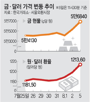 달러와 함께 대표적 안전자산으로 꼽히는 금 가격과 거래량도 천정부지로 치솟고 있다. 한국거래소에 따르면 5일 11시 30분 KRX 금 시장에서 금 현물은 g당 5만6840원에 거래되고 있다. 이날 전일 종가 대비 0.74% 오른 5만5820원으로 장을 시작해 2014년 3월 KRX 금 시장 개설 이후 사상 최고치를 경신했다. 지난 2일 금 가격은 종가 기준 g당 5만5410원으로 사상 최고치를 기록했다. 이날에만 146㎏ 상당의 금이 거래되면서 거래량 역시 최대치를 찍었다. 7월 한 달 하루 평균 거래량의 5배에 달하는 규모다.