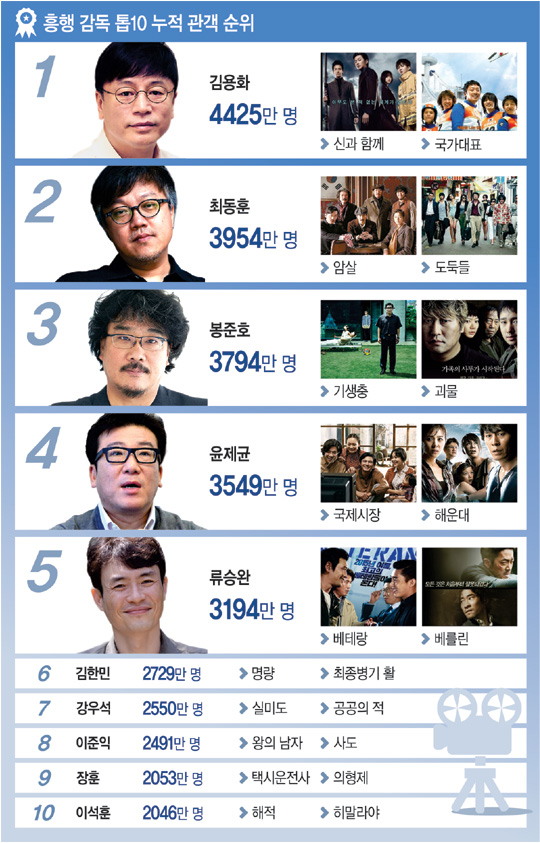 여름 성수기 극장가는 검증된 중견과 파릇파릇한 신인 감독들이 혈전을 치르고 있다. 올해 이미 ‘극한직업’과 ‘기생충’, 두 편의 1000만 영화를 배출한 한국 영화계의 목표는 여전히 1000만 고지다. 2003년 ‘실미도’ 이후 현재까지 이 고지를 정복한 한국 영화는 총 19편. ‘영화는 감독의 예술’이라는 말이 있듯 1000만 영화 뒤에는 탄탄한 연출력으로 무장한 감독들이 버티고 있다. 배우들의 경우 송강호, 황정민, 하정우 등이 누적 관객 수 1억 명을 돌파했지만, 매년 작품을 선보이거나 겹치기 연출이 불가능한 감독들의 관객 수는 이를 밑돌 수밖에 없다. 그렇다면 역대 가장 많은 관객을 극장으로 불러온 감독은 누구일까? 문화일보가 ‘실미도’ 이후 16년간 모든 감독의 작품을 전수조사해 ‘빅5’를 추렸다. 단, 손익분기점을 넘기지 못한 영화는 집계에서 제외했다.