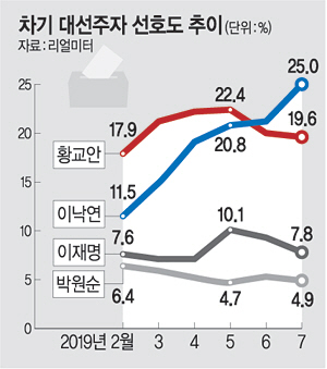 이현출 건국대 정치외교학과 교수는 “황 대표의 경우 최근 당내·외에서 여러 가지 실수가 있었고 이 과정에서 이탈자가 제법 발생했다”며 “이런 상황에서 대외적 여건, 특히 일본 경제 보복 여파가 여권에 유리하게 작용하면서 지지가 이 총리에게 쏠리고 있다”고 했다.