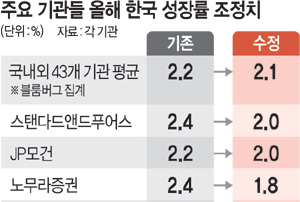 문제는 이달 들어 리스크(위험)가 확산하면서 성장률 전망이 힘들 정도로 불확실성이 커질 수 있다는 점이다. 이미 글로벌 기관들은 정부의 경제 성장률 전망치(2.4∼2.5%)나 한국은행의 전망치(2.2%)가 낙관적이라는 평가를 내린 처지다. 이럴 경우 1%대 후반도 안심할 수 없다는 우려가 나온다. 올해 성장률이 1%대를 기록하면 글로벌 금융위기 당시(2009년 0.8%) 이후 가장 낮은 수준을 기록하게 된다.
