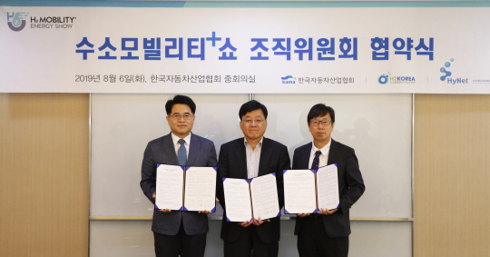 한국자동차산업협회(회장 정만기·가운데)는 수소융합얼라이언스추진단, 수소에너지네트워크와 함께 내년 3월에 ‘수소모빌리티+쇼’를 개최하기 위해 6일 서울 서초구 반포대로 자동차산업협회에서 업무협약을 체결했다고 7일 밝혔다. 행사는 수소 모빌리티, 전기 모빌리티, 신재생에너지 등 3대 주제로 열리며 위원장은 정 회장이 맡았다.