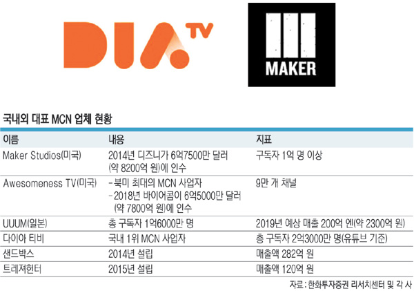 MCN은 성장 사업이다. 미국에서는 2009년 창업한 ‘메이커 스튜디오(Maker Studios)’와 2012년 출범한 ‘어섬니스 TV(Awesomeness TV)’가 대표주자다. 디즈니와 바이어콤이 각각 8000억 원 가까운 거액을 들여 사들였다. 거대 미디어그룹이 비싼 가격에 매입했다는 것은 미래 전망이 그만큼 밝다는 뜻이다. 국내에서는 CJ그룹 계열사 CJ ENM이 2013년 만든 ‘다이아 티비(DIA TV)’가 선두주자다. 구독자 100만 명 이상을 거느린 밀리언 창작자 62개 팀과 파트너 관계를 맺고 있다.