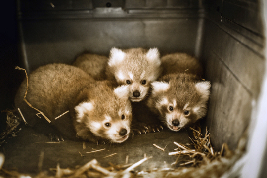 미국 버지니아주의 동물원에서 레서판다 세 마리가 몸을 맞대고 모여 있다. 19일 버지니아 동물원은 두 달 전 레서판다 세 마리가 태어났다는 소식을 알렸다.