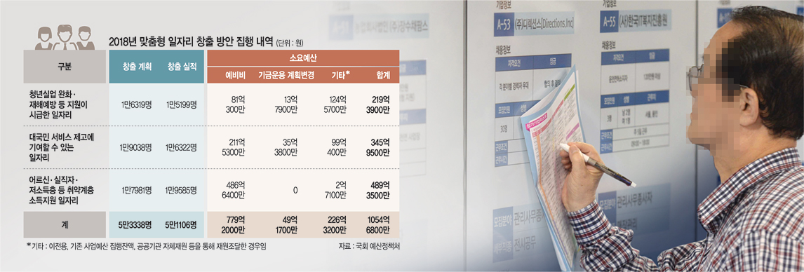 20일 문화일보 취재진이 국회 환경노동위원회 신보라(자유한국당) 의원실을 통해 입수한 국회예산정책처의 ‘재정지원 일자리사업 분석 기초자료’에 따르면, 정부는 지난 연말 맞춤형 일자리를 창출하는 데 총 1058억6800만 원의 예산을 투입했다. 구체적으로 ‘청년실업 완화·재해예방 등 지원이 시급한 일자리’에 219억3900만 원, ‘대국민 서비스 제고에 기여할 수 있는 일자리’에 345억9500만 원, ‘어르신·실직자·저소득층 등 취약계층 소득지원 일자리’에 489억3500만 원을 집행해 모두 5만1106개의 일자리를 만들어 냈다.