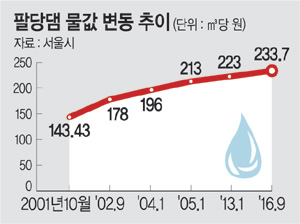 20일 서울시에 따르면, 하루 평균 20만5000t의 팔당댐 물을 쓰고 있는 광암정수센터에 한강 물을 공급하기 위해 취수원 이중화 사업 재추진을 검토하고 있다. 시내 암사2취수장과 광암정수센터를 연결하는 8.8㎞ 길이의 도관을 만들고 펌프시설을 개량, 저렴한 한강 물 사용 비중을 늘려 팔당댐 물 사용량을 줄이려는 목적이다. 한강 물값이 ㎥당 52.7원인 데 반해 팔당댐 물값은 한강의 4배 이상으로 비싼 233.7원이고, 시차를 두고 계속 가격이 올라 경영에 큰 부담이 되고 있다는 게 시의 설명이다.