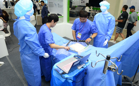 21일 오전 서울 강남구 삼성동 코엑스에서 열린 ‘국제 병원의료 산업박람회’를 찾은 관람객들이 1회용 수술용품을 살펴보고 있다.