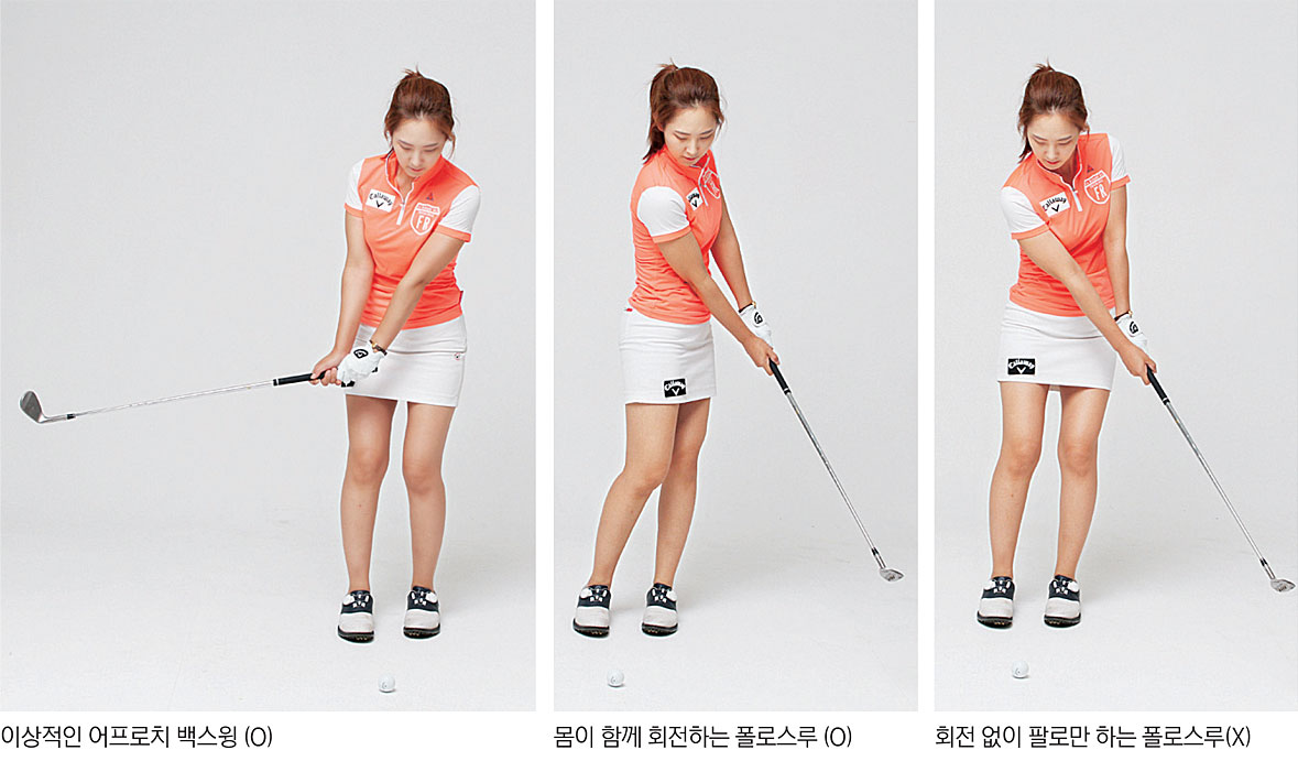 어프로치도 스윙 크기에 비례해 회전이 이뤄져야 합니다. 풀스윙과 다르게 어프로치의 폴로스루는 왼팔이 몸에 붙어 보기에는 당겨친 게 아닌가 하는 동작이 나오게 됩니다. 스윙의 크기가 작아 풀스윙과는 조금 다른 느낌의 폴로스루가 나오는 것이죠. 어프로치 스윙은 왼팔을 몸에 붙여 고정한 후 백스윙보다 조금 더 긴 폴로스루를 해야 합니다. 이때 폴로스루의 길이만큼 히프의 회전이 같아야 부드럽고 안정적인 어프로치 스윙이 나옵니다. 스윙의 크기가 작을 때에도 확실한 히프의 회전을 유지할 수 있도록 유의하세요. 이때 상체의 움직임도 중요한데, 히프가 회전한다고 상체가 곧바로 돌면 겉회전이 돼 볼이 덮어 맞고 방향이 왼쪽으로 가게 됩니다. 상체, 즉 어깨의 움직임은 퍼터와 같이 회전보다 수직이어야 합니다. 오른쪽 어깨가 떨어지는 느낌이 들어야 합니다. 그래야 헤드가 일직선으로 움직이고 여기에 히프의 회전이 더해져 볼을 똑바로 보낼 수 있게 되는 것입니다.