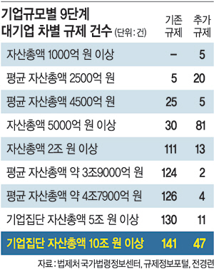 한국경제연구원의 대기업차별규제 조사 결과는 중소기업에서 중견기업, 다시 대기업으로 성장하기까지 그물망 덫처럼 도사린 규제의 실태를 적나라하게 보여준다. 통상 창업 벤처기업이 기술개발에 성공해도 중소기업과 사업화 단계까지 따르는 어려움을 일컫는 ‘죽음의 계곡(溪谷)’에 견줄 만한 ‘죽음의 규제 9단계 계곡’이다. 성장 단계마다 규제를 피할 수 없으니 중소·중견기업들은 다음 단계로 진입하기를 오히려 꺼리는 ‘피터 팬 증후군’을 보이고 있다. 경제계는 시대에 뒤떨어진 차별적 규제로는 신산업 활성화, 급격한 경기변동, 글로벌 경제 환경에 유연하게 대처할 수 없다며 전면 재검토를 요청하고 있다.