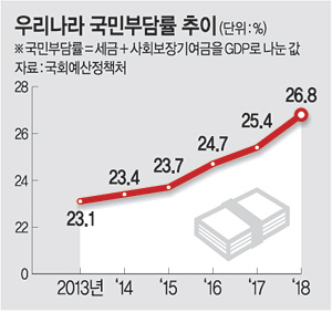 26일 국회예산정책처의 ‘2019 조세 수첩’에 따르면 지난해 우리나라 국민부담률은 26.8%로 집계됐다. 이는 전년(25.4%) 대비 1.4%포인트 오른 것으로, 지난 10년간 연간 상승 폭 중에서 가장 높다. 지난해 세수 호황 기조가 이어진 데다 각종 복지제도가 확대되면서 국민부담률이 가파르게 상승한 것으로 풀이된다. 국민부담률이란 한 해 국민이 내는 세금(국세+지방세)에 사회보장기여금(국민연금보험료, 건강보험료, 고용보험료 등)을 더한 뒤 이를 그해 국내총생산(GDP)으로 나눈 값이다.