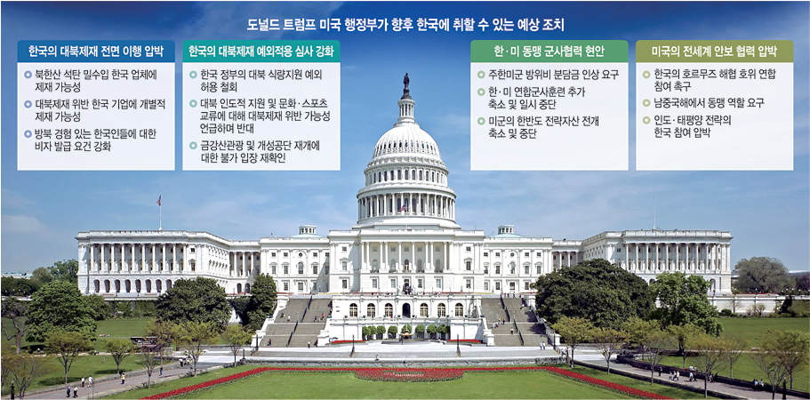 하지만 더 문제는 대북정책에 미칠 영향이다. 트럼프 행정부 관계자들은 문재인 정부의 한반도 평화체제와 평화경제 구상에 제동을 걸 가능성이 크다는 게 외교가의 대체적 견해다. 한·미는 개성남북공동연락사무소, 남북철도공동사업, 국제기구를 통한 대북 인도적 지원 등 남북교류 및 사업과 관련해 잦은 이견을 드러냈지만 긴밀한 조율을 통해 이를 극복해 왔는데, 앞으로는 이를 장담하기 어렵다는 이야기가 워싱턴 외교가에서 흘러나온다. 한·미 간 신뢰 관계에 금이 간 상황에서 대북 공조가 원활히 이뤄지기 어렵다는 지적이다. 이 경우 남북관계가 회복 궤도에 오르더라도 남북교류나 남북경제협력 사업 등을 추진하는 데 큰 어려움이 예상된다. 미국이 대북 제재의 고삐를 풀지 않는 상황에서 한국이 중국·러시아 등과 함께 미국의 ‘세컨더리 보이콧(제3자 제재)’ 대상국이 될 위험도 있다.