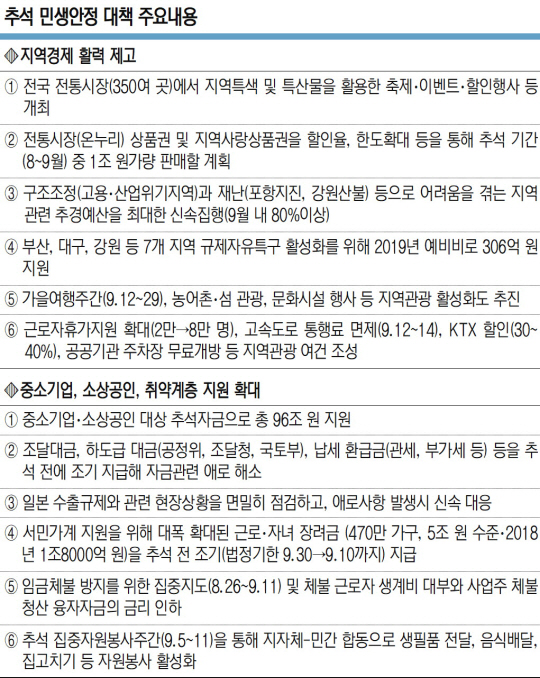 또 정부와 금융권이 추석을 전후로 중소기업·소상공인 등의 명절 자금 수요를 뒷받침하기 위해 96조 원 지원에 나선다. 지난해보다 신규자금, 대출·보증 만기 연장, 외상매출채권보험 등 지원액이 10조 원 늘어났다.