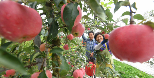 4일 경남 거창군 고제면의 한 과수원에서 농민들이 추석 연휴(12∼15일)를 앞두고 빨갛게 익은 홍로사과를 수확하고 있다.
