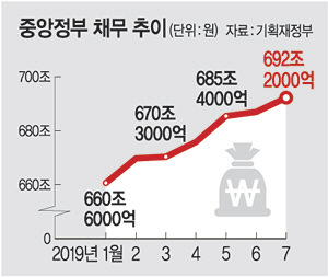 10일 기획재정부가 내놓은 ‘월간 재정동향’(2019년 9월)을 보면, 올해 7월 말 기준 중앙정부 채무는 전월 대비 5조4000억 원 증가한 692조2000억 원을 기록했다. 중앙정부 채무는 올해 1월까지만 해도 660조6000억 원이었지만, 조만간 700조 원을 넘어설 게 확실시된다.