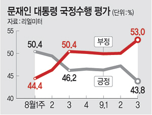 리얼미터 정례 여론조사에서 문재인 대통령의 국정수행에 대한 긍정 평가가 취임 후 최저치인 43.8%를, 부정 평가는 취임 후 최고치인 53.0%를 기록한 것으로 19일 발표됐다.
