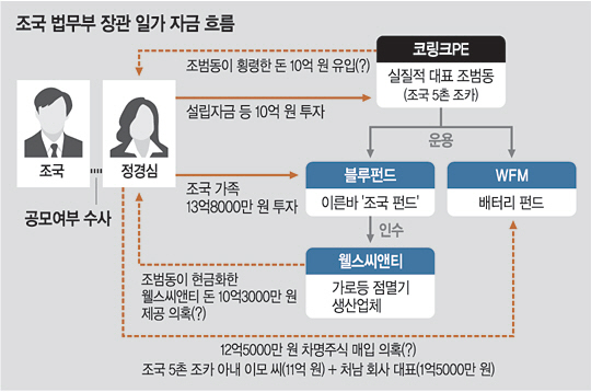 검찰이 조 장관 일가의 금융 계좌 추적 압수수색을 통해 겨냥하는 것은 조 장관 일가의 40억 원 규모에 달하는 수상한 자금거래 정황이다. 조 장관 부인 정 교수는 코링크의 설립과 운영을 실질적으로 주도하고 이 과정에서 친인척의 명의를 동원해 주식 차명 거래를 한 의혹을 받고 있다. 검찰은 코링크 초기 설립자금 등 10억 원도 정 교수 돈으로 의심하고 있다. 그 밖에 수사팀은 코링크와 2차 전지 업체 WFM에서 정 교수 측으로 흘러간 자금에도 주목하고 있다. ‘위장매매’ 의혹 등 친인척 간의 수상한 부동산 거래 정황도 지적된 바 있다.