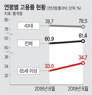 지난달 ‘고용지표가 개선됐다’며 고용시장에 ‘훈기’가 돌고 있다고 밝힌 정부의 인식이 산업 현장에서는 전혀 공감을 얻지 못하고 있다. 지난달 전체 취업자 수 증가 폭의 86%가량은 60세 이상이 견인한 것이다. 재정을 투입해 끌어올린 일자리 정책의 한계를 그대로 보여준다. ‘경제 허리’ 역할을 하는 40대 취업자는 전년 동월 대비 12만7000명이 감소해 45개월째 하락세를 면치 못하고 있고, 30대 취업자도 9000명이 줄었다.