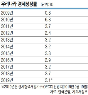 24일 기획재정부 등에 따르면 경제협력개발기구(OECD)는 지난 19일 발표한 ‘중간 경제전망’에서 올해 우리나라 성장률을 종전 2.4%에서 2.1%로 0.3%포인트나 낮췄다. 발 빠르게 움직이는 해외투자은행(IB)의 올해 한국 성장률 전망치는 더 낮다. 국제금융센터가 집계하는 9개 IB의 올해 한국 성장률 전망치 평균은 8월 말 기준으로 이미 2.0%까지 낮아졌다. 조만간 1%대로 추락할 가능성도 배제할 수 없다.