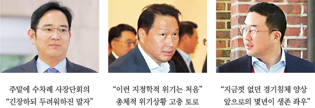 이 부회장은 상반기부터 수차례 주말에 사장단 회의를 열고 상황을 점검하며 “긴장하되 두려워하지는 말자”고 독려하고 있다. 전국경제인연합회 회장인 허창수 GS 회장도 최근 ‘GS 최고경영자 전략회의’에서 “우리 경제가 고령화·저출산의 인구 변화와 신규 성장동력 확보의 어려움으로 저성장 위기에 직면해 있다”며 “‘혁신의 근력’을 키워야 할 때”라고 지적한 바 있다. 재계 관계자는 “가뜩이나 경제성장을 이끌 동력은 찾기 힘든데 총선을 앞두고 정치 상황의 불안정성까지 한층 심화하자 우려의 목소리가 높아지고 있다”고 말했다.