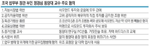 법조계에 따르면 조 씨와 최 씨가 동시 기소될 가능성이 높은데 정 교수의 혐의도 이들 공소장에 적시될 확률이 상당한 것으로 알려졌다. 현재 검찰과 소환 일정을 조율 중인 정 교수에게 적용될 혐의는 최소 5개 이상이다. 우선 정 교수는 조 장관 일가가 출자한 코링크를 둘러싼 의혹에 대해 집중적으로 조사받을 예정이다.