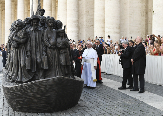 프란치스코 교황이 세계 이주민·난민의 날인 29일 바티칸 성 베드로 광장에서 이주민들의 모습을 형상화한 캐나다 조각가 티머시 슈말츠의 작품에 대한 설명을 듣고 있다.