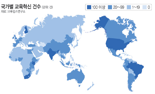 이주호 전 교육과학기술부 장관(한국개발연구원 국제정책대학원 교수)은 미국 브루킹스연구소의 최신 보고서를 노트북 PC 화면에 띄운 채 세계지도를 손으로 가리키며 물었다. 지도에는 교육 혁신이 이뤄진 나라들이 깨알같이 표시돼 있었다. 세계 1, 2위인 미국(618건), 인도(320건)를 지나 손가락이 가리킨 곳에는 우간다(94건), 르완다(46건), 캄보디아(20건) 등이 눈에 띄었다. ‘혁신은 어디에서 일어나고 있는가(Where are innovation occuring)?’라고 적힌 지도에서 정작 한국은 찾아볼 수 없었다. 이 전 장관은 “세계적 싱크탱크인 브루킹스연구소의 시각에서 볼 때 한국은 교육 혁신이 한 건도 없는 나라”라며 “아프리카보다도 못한 지경”이라고 단언했다. 이 전 장관은 우리나라도 교육 혁신을 위해서는 ‘인공지능(AI)을 활용한 맞춤형 학습 방식과 동기부여자이자 학습 디자이너로서 교사의 역할 변화’를 본격 고민해야 할 때라고 목소리를 높이는 이유라고 강변했다.