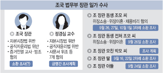 서울중앙지검 특수2부는 금명간 정 교수를 소환해 조사하기로 방침을 정하고 이른바 ‘조국 펀드’와 관련한 자본시장법 위반, 공직자윤리법 위반, 금융실명법 위반 혐의를 재검토하고 있다. 정 교수는 딸 입시 의혹과 관련해 증거인멸 교사, 사문서위조 행사 등의 혐의도 받는다. 검찰은 정 교수의 혐의가 워낙 방대한 만큼 두 차례 이상 소환조사가 필요하다고 보고 있다.