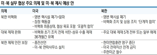 ◇北 단계적 해법 일부 수용 시 ‘핵보유국 인정 수순’ 우려 = 6·30 판문점 회동 직후 귀국 길 비행기에서 스티븐 비건 미 국무부 대북정책특별대표는 북핵 동결을 조건으로 북한에 인도적 지원과 인적 교류 확대, 평양 연락사무소 개설 등과 같은 상응 조치를 해줄 의향이 있다고 밝힌 바 있다. 미국은 비핵화의 최종상태 합의와 비핵화 로드맵 논의를 여전히 바라지만, 논의 진행 과정에서 북한과 일부 ‘주고받기(타협)’를 할 수 있다는 여지를 남긴 것이다. 미국이 5일 실무협상에서 이 같은 입장을 밝힐지 미지수지만 협상 진전을 위해 북한의 단계적·동시적 해법을 어느 정도 수용할 가능성이 커 보인다. 하지만 단계적 해법은 향후 북한이 추가적인 비핵화 협상을 거부하고 상응 조치의 이득만 취한 채 협상 결렬을 선언할 위험성이 있다. 신범철 아산정책연구원 안보통일센터장은 “북한의 비핵화가 무엇을 의미하는지 포괄적인 합의 없이 단계적·동시적 해법으로 가면 북한이 사실상 핵보유국으로 굳어질 수 있다”고 우려했다.