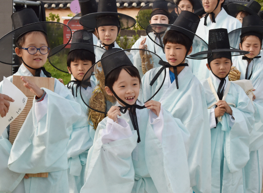 제56회 수원화성문화제의 일환으로 6일 경기 수원시 팔달구 화성행궁 낙남헌에서 열린 ‘과거시험 보는 날’ 행사에서 갓을 쓰고 도포를 입은 어린이들이 각양각색의 표정을 짓고 있다.